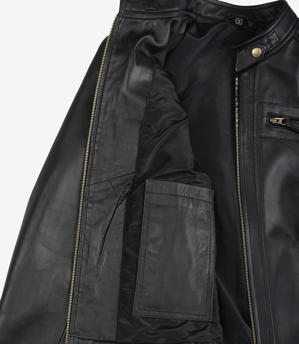 Featuring a timeless biker design, this jacket includes a stylish front zipper closure, modern slim-fit cut, and elegant black leather finish that complements both casual and edgy fashion styles. The smooth inner lining ensures comfort, while the tailored structure provides a flattering silhouette.