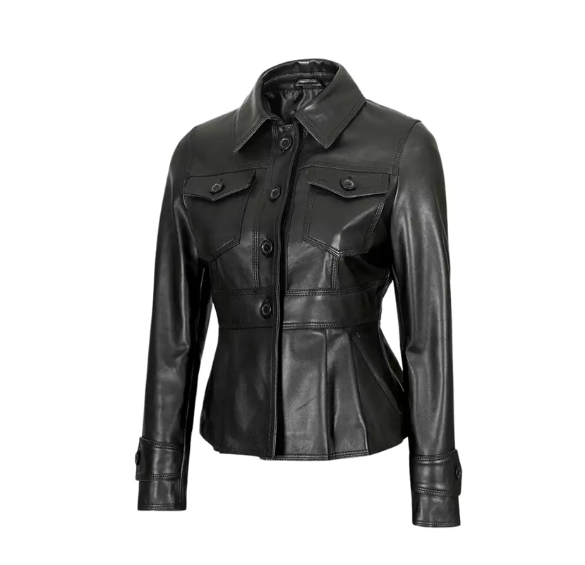Crafted from premium-quality leather, its tailored peplum design enhances your silhouette, offering a flattering fit that complements any body shape. The rich black tone makes it a versatile choice for pairing with jeans, skirts, or dresses.